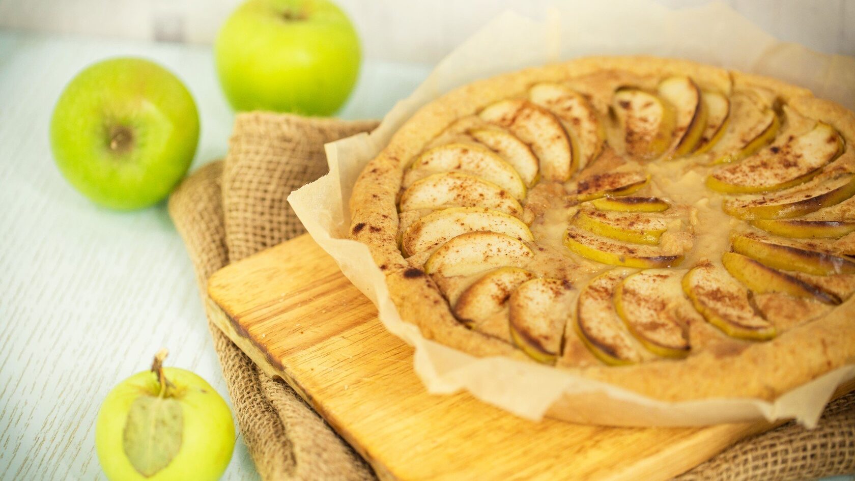 Сначала нужно заместить песочное тесто. Холодное маcло положить в миску, добавить 1,5 стакана муки, соду и порубить ножом или растереть руками. В масляную крошку добавить сметану и быстро вымесить эластичное тесто. При необходимости добавить ещё немного муки, чтобы тесто не липло к рукам. Песочное тесто не любит долгого вымешивания, от этого оно может стать жестким. Готовое тесто положить в холодильник на полчаса. За это время приготовить начинку. Сначала делаем сметанную заливку. Муку, сахар и яйцо смешать, растереть до однородности, затем добавить сметану и мускатный орех. Яблоки очистить от сердцевины и шкурки, нашинковать очень тонкими ломтиками, сбрызнуть лимонным соком. Форму для пирогов (лучше всего разборную) смазать и распределить тесто тонким слоем по дну и бортикам, чтобы получилась чаша из теста. Выложить яблоки и залить их заливкой. Поставить пирог в разогретую духовку и печь около 40-50 минут при температуре 170 градусов. Готовый пирог нужно полностью остудить, можно даже поставить на несколько часов в холодильник. После выпечки пирог обязательно надо остудить.